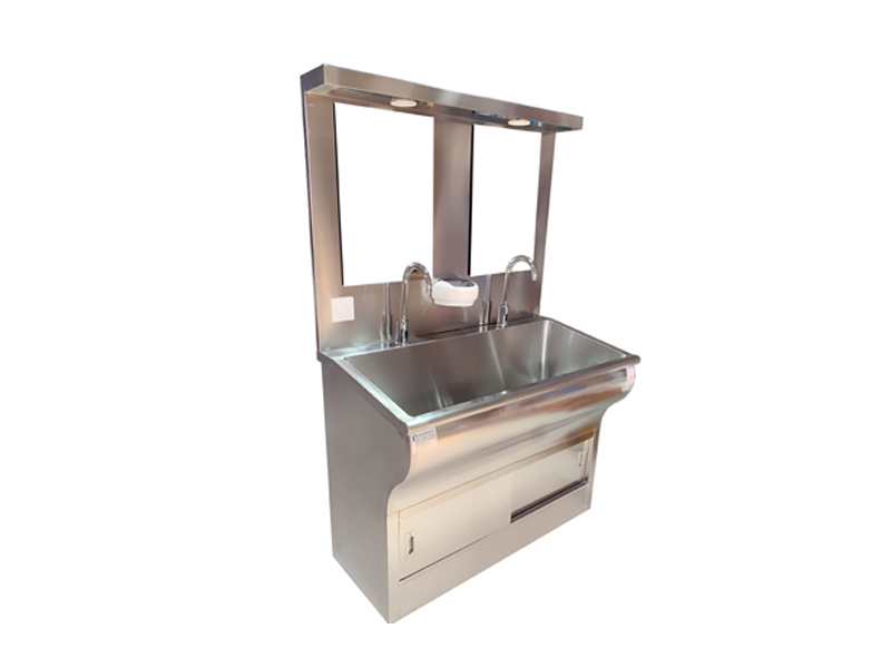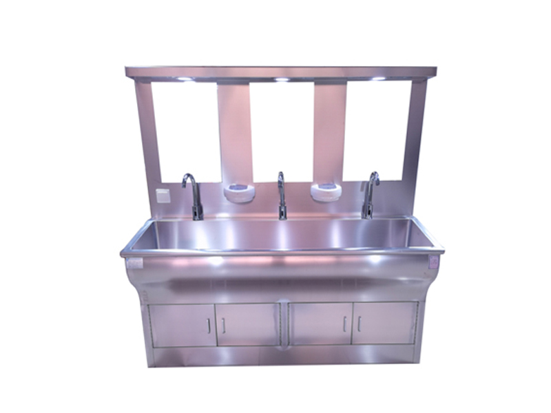 不銹鋼潔凈洗手池分為一人位、雙人位、三人位、四人位等,可根據客戶(hù)要求定制。無(wú)塵室不銹鋼洗手池、洗手槽采用SUS304不銹鋼制作,中間特殊靜音處理。槽身以人體工程學(xué)設計洗手時(shí)水花不易濺到身上。鵝頸型水龍頭,光控感應式出水,可靠。配紅外線(xiàn)感應給皂液裝置,醫用洗手池可選裝自帶40L美的電熱水器,自由設定出水溫度,一年四季可提供恒溫水,水龍頭感應自動(dòng)出水,每個(gè)洗手位帶獨立鏡燈和鏡子,洗手槽采用特制的坡度設計,可有效防止水濺到洗手池外,各水嘴獨立設置,不影響其它水嘴的使用。