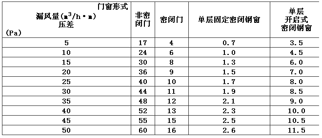 單位長(cháng)度縫隙滲漏空氣量用公式計算是比較困難的,一般是通過(guò)不同形式的門(mén)、窗進(jìn)行多次試驗的數據統計后得出的。表7是對國內潔凈室的20多種常用的門(mén)、窗在實(shí)驗室進(jìn)行了大量的試驗后取得的數據,雖然近年來(lái)潔凈室門(mén)窗的材料和形式有很大的發(fā)展,但目前還有部分潔凈室仍然采用鋼制密封門(mén)窗,故表7中的數據仍可供設計時(shí)參考。