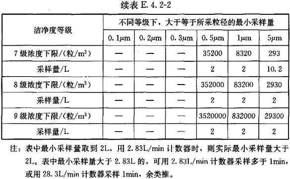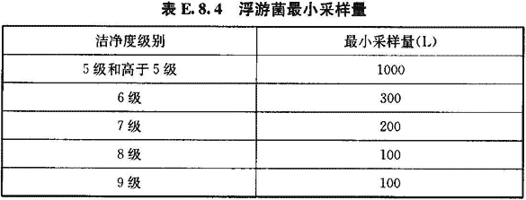 4 每點(diǎn)采樣1次,如工藝無(wú)特殊要求,每次采樣量應大于等于表E.8.4推薦的浮游菌最小采樣量。