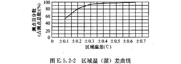 區域溫差、區域相對濕度差:按測點(diǎn)中最低或最高的一次測定值與各測點(diǎn)平均溫度和平均相對濕度的差值的測點(diǎn)數,占測點(diǎn)總數的百分比,整理成累計統計曲線(xiàn)(圖E.5.2—2)。