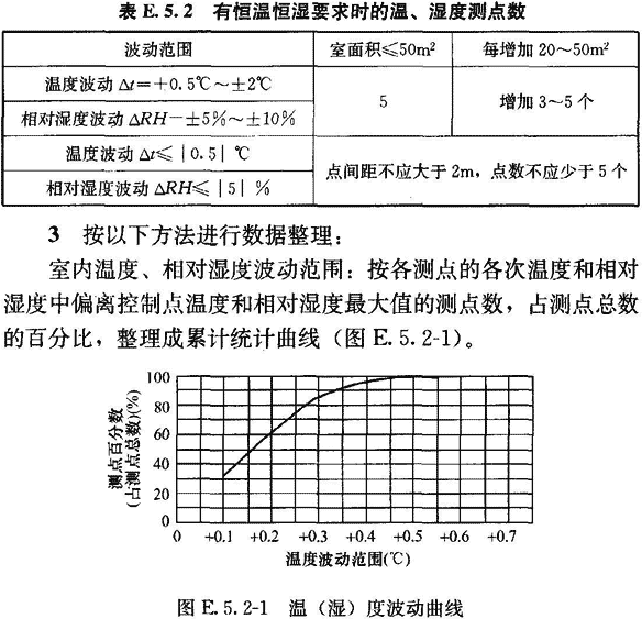 2)根據溫度和相對濕度波動(dòng)范圍(表E.5.2),應選擇相應的具有足夠精度的儀表進(jìn)行測定。根據由低到高的精度,測定宜連續進(jìn)行(8~48)h,每次測定間隔不應大于30min;
