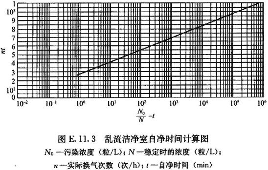 E.11.3 由測得的開(kāi)機前原始濃度或發(fā)煙停止后1min的污染濃度(N0)、室內達到穩定時(shí)的濃度(N)和實(shí)際換氣次數(n)查圖E.11.3,得到計算自?xún)魰r(shí)間,再和實(shí)測自?xún)魰r(shí)間進(jìn)行對比。