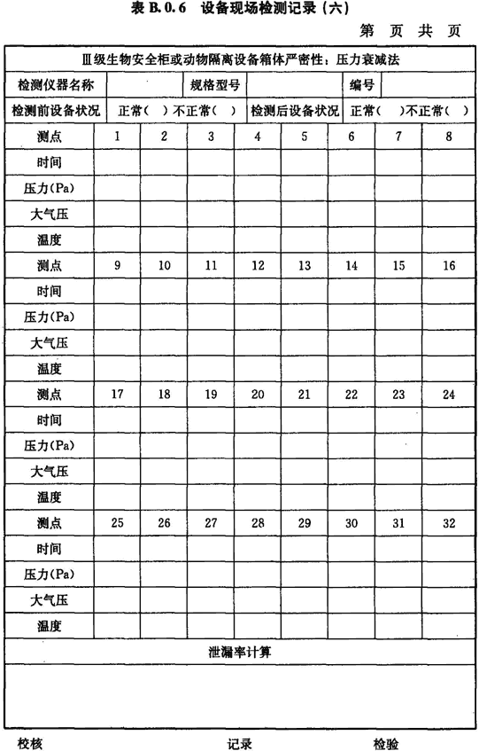 B.0.6 Ⅲ級生物安全柜或動(dòng)物隔離設備箱體密封性的檢測應按表B.0.6進(jìn)行記錄。
