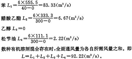 算例:某車(chē)間使用脫漆劑,每小時(shí)消耗量為4kg。脫漆劑成分為苯50%,醋酸乙酯30%,乙醇10%,松節油10%,求全面通風(fēng)所需的空氣量。