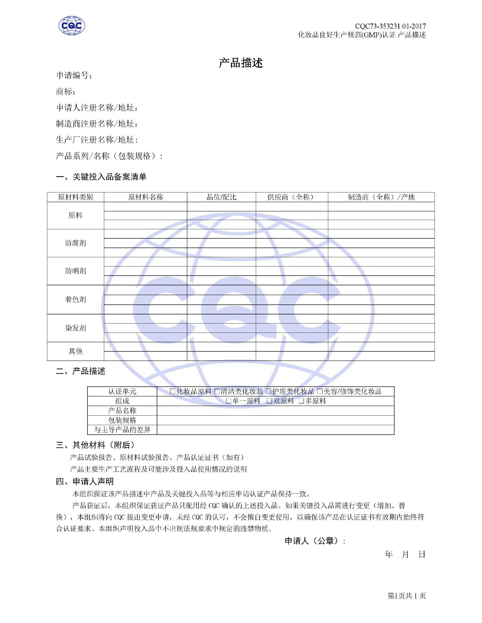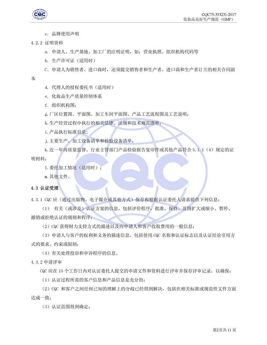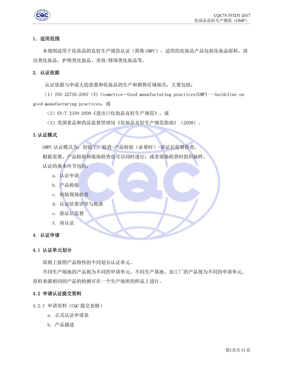 認證依據為美國農業(yè)部《Cosmetic Good Manufacturing Practice Guideline》, European Federation for Cosmetic Ingredients (EFfIC)-GMP for cosmetic ingredient,ISO 22716-2007《化妝品良好生產(chǎn)規范》、CQC73-353231-2016《化妝品認證實(shí)施規則》及適用的法律法規等。