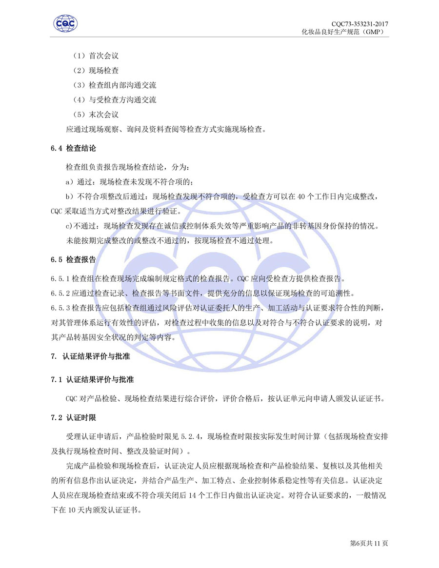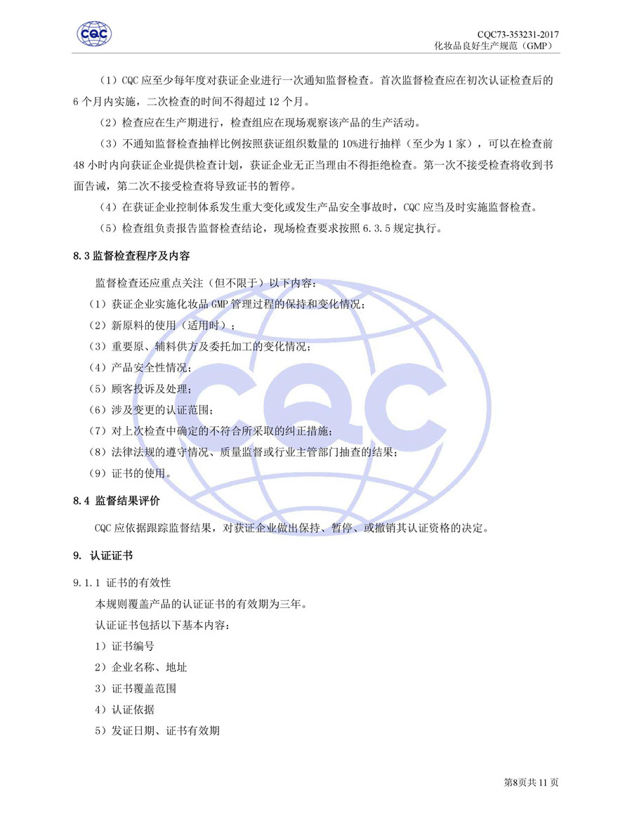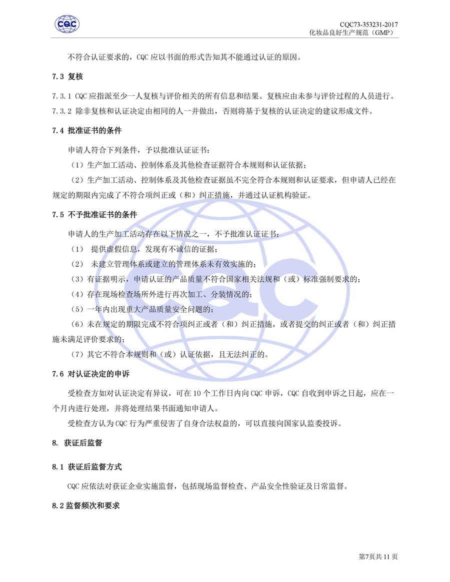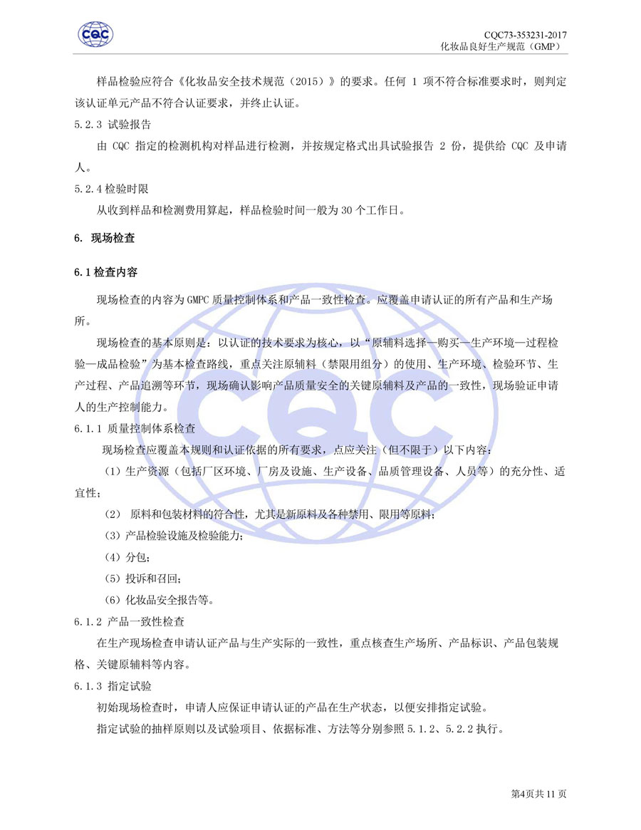 認證依據為美國農業(yè)部《Cosmetic Good Manufacturing Practice Guideline》, European Federation for Cosmetic Ingredients (EFfIC)-GMP for cosmetic ingredient,ISO 22716-2007《化妝品良好生產(chǎn)規范》、CQC73-353231-2016《化妝品認證實(shí)施規則》及適用的法律法規等。